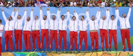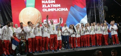 Више десетина хиљада Београђана поздравило је вечерас испред Дома Народне скупштине српске спортисте који су на Олимпијским играма у Рију освојили рекордних осам медаља. У спектакуларној атмосфери, мноштво застава и транспарента, прво је дечији хор отпевао химну „Боже правде”, затим су на бину изашли спортисти који нису освојили медаље, а онда и носиоце медаља.