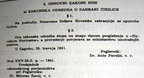 "На подручју Независне Државе Хрватске забрањује се употреба ћирилице", писало је у Законској одредби о забрани ћирилице која је донета 25. априла 1941. године, две недеље после проглашења НДХ, подсећа хрватски портал Index.hr.